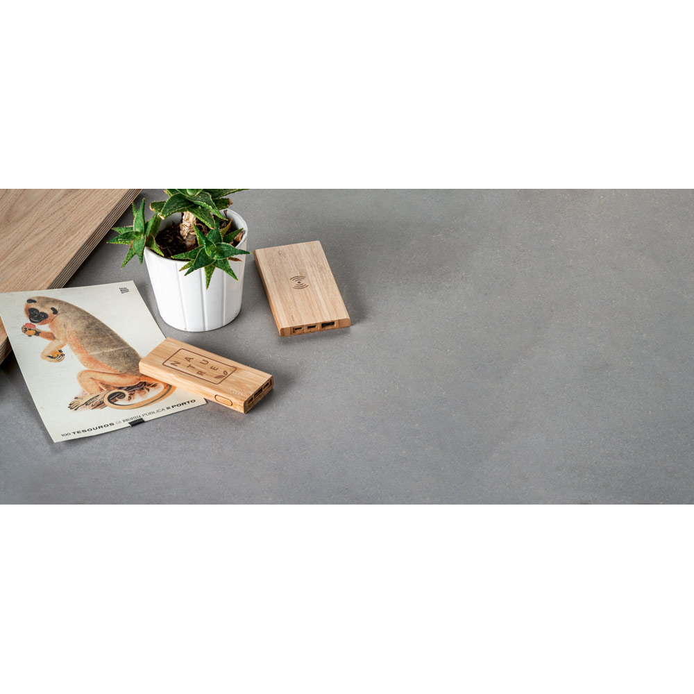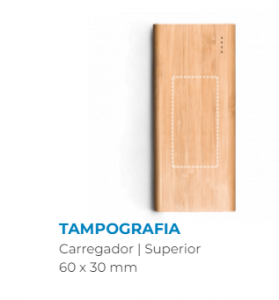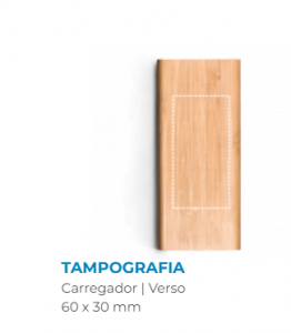 Bateria portátil em bambu com bateria de lítio com capacidade de 5.000 mAh e tempo de vida ≥ 500 ciclos. Entrada 5V/2A e saída 5V/1-2A com 1 porta micro USB, 1 porta USB tipo C e 1 porta USB. Inclui cabo USB / micro USB para carregar e contém indicador de carga. Fornecido em caixa presente de papel craft. 120 x 51 x 15 mm