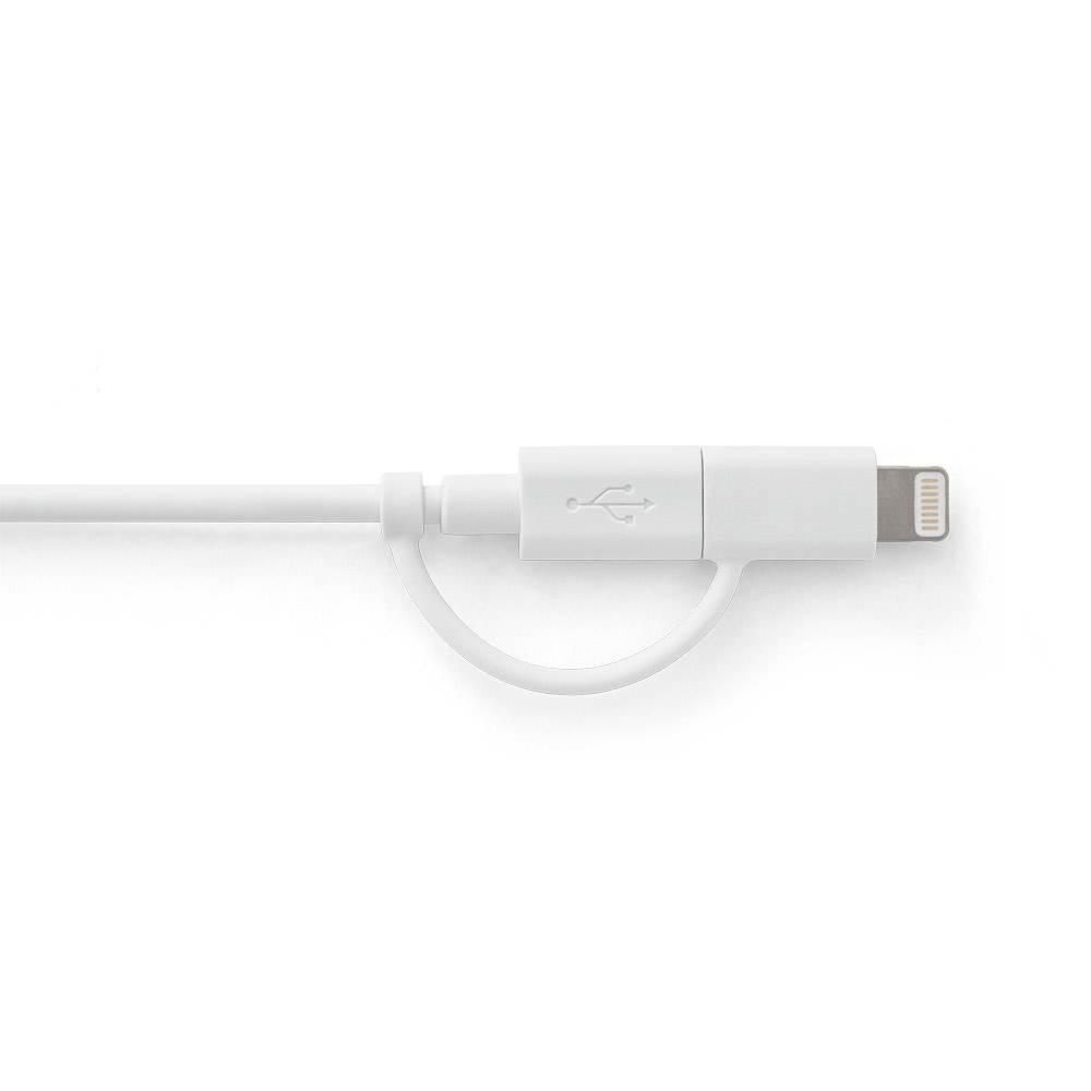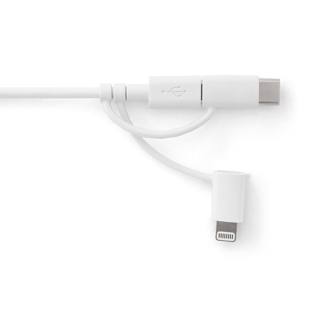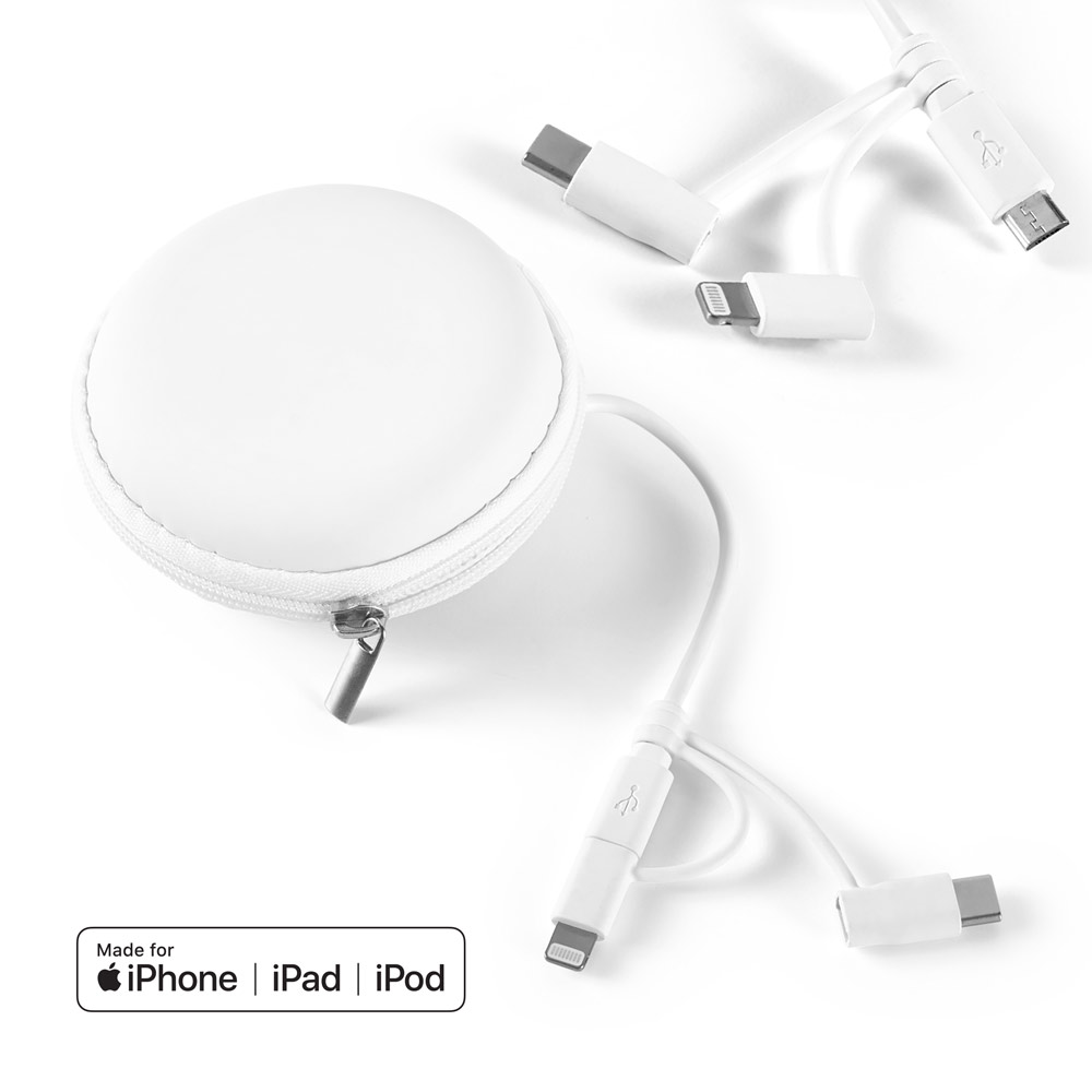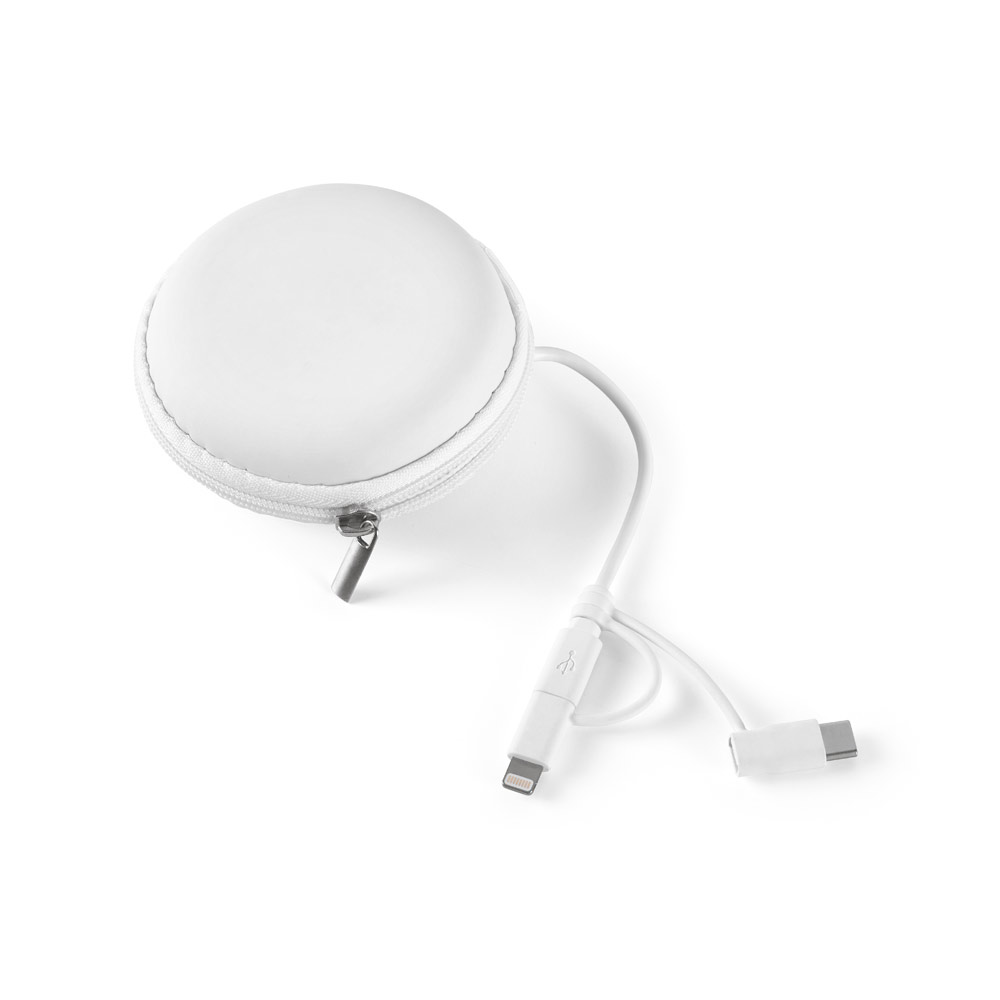 Cabo USB 3 em 1 adequado para carregar dispositivos móveis. Dispõe de um conector micro USB e adaptadores Lightning® (com certificação MFI) e USB tipo C. Fornecido em bolsa de EVA. Cabo: 1020 mm | Bolsa: ø75 x 36 mm