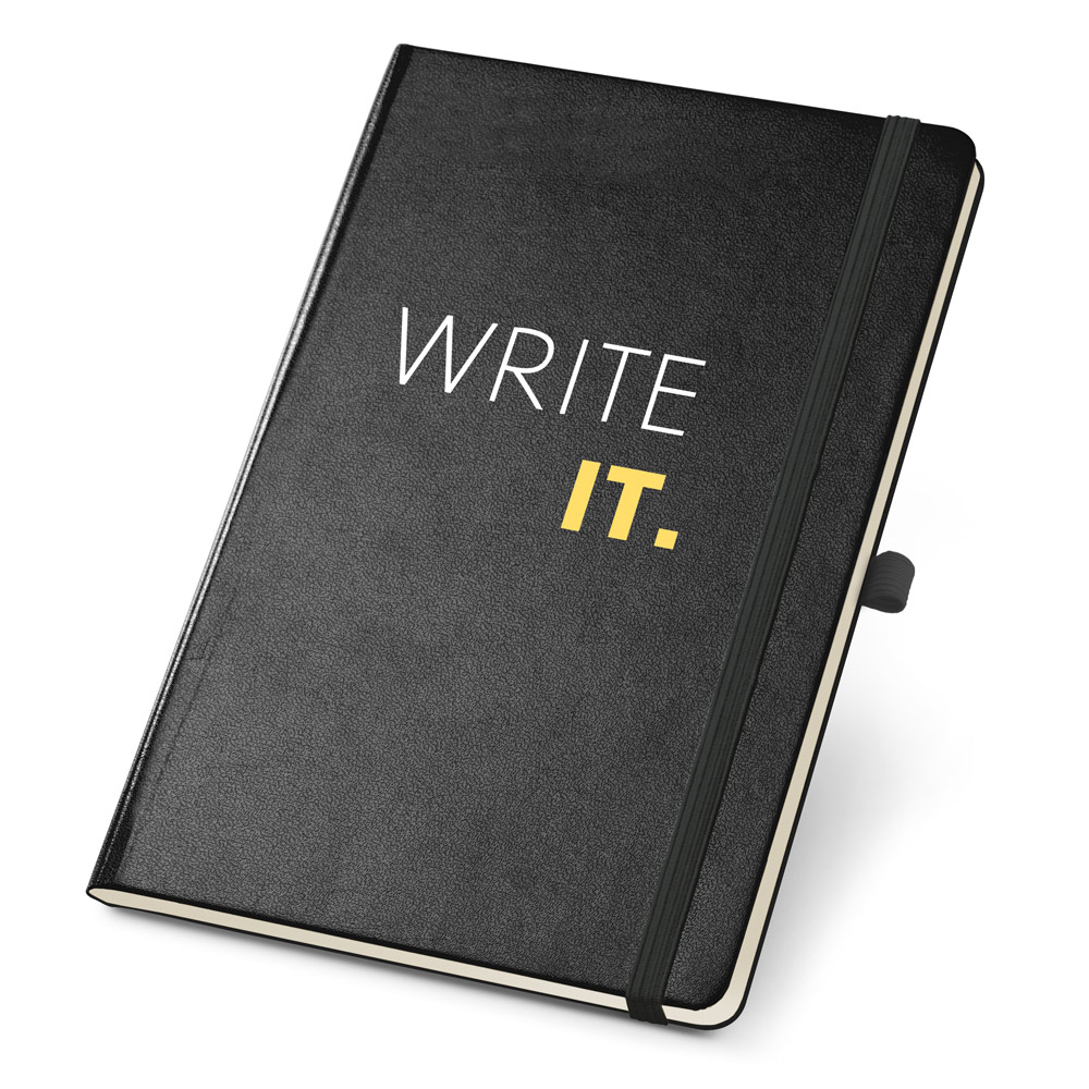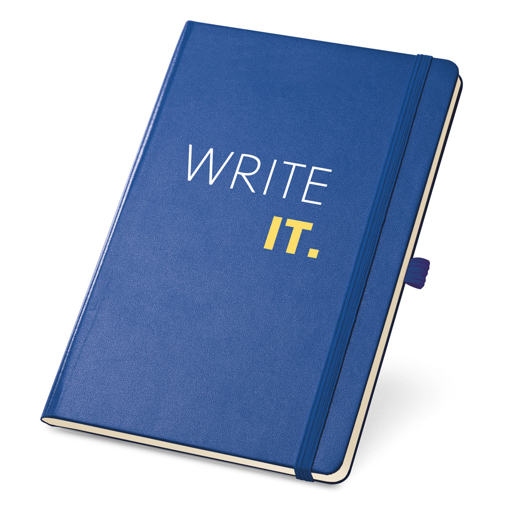 Caderno A5 com 80 folhas não pautadas em cor marfim e capa dura. Contém bolso interior, fita separadora, elástico e suporte para esferográfica (não inclusa). 137 x 210 mm