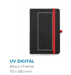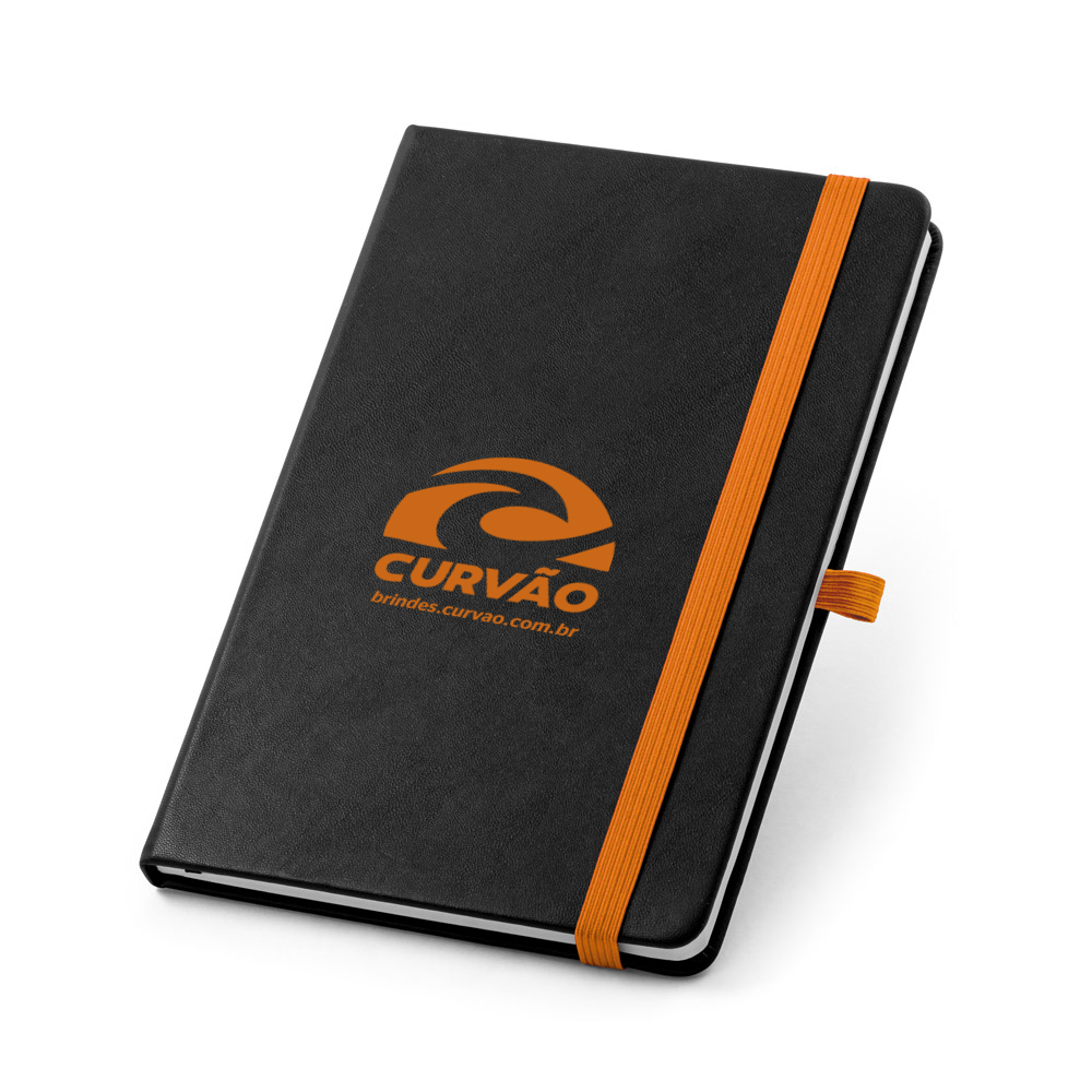 Caderno A5 com capa dura em PU térmico e 80 folhas pautadas. Contém elástico, fita separadora, bolso em papel na parte traseira da capa e suporte para esferográfica (não inclusa). 140 x 210 mm