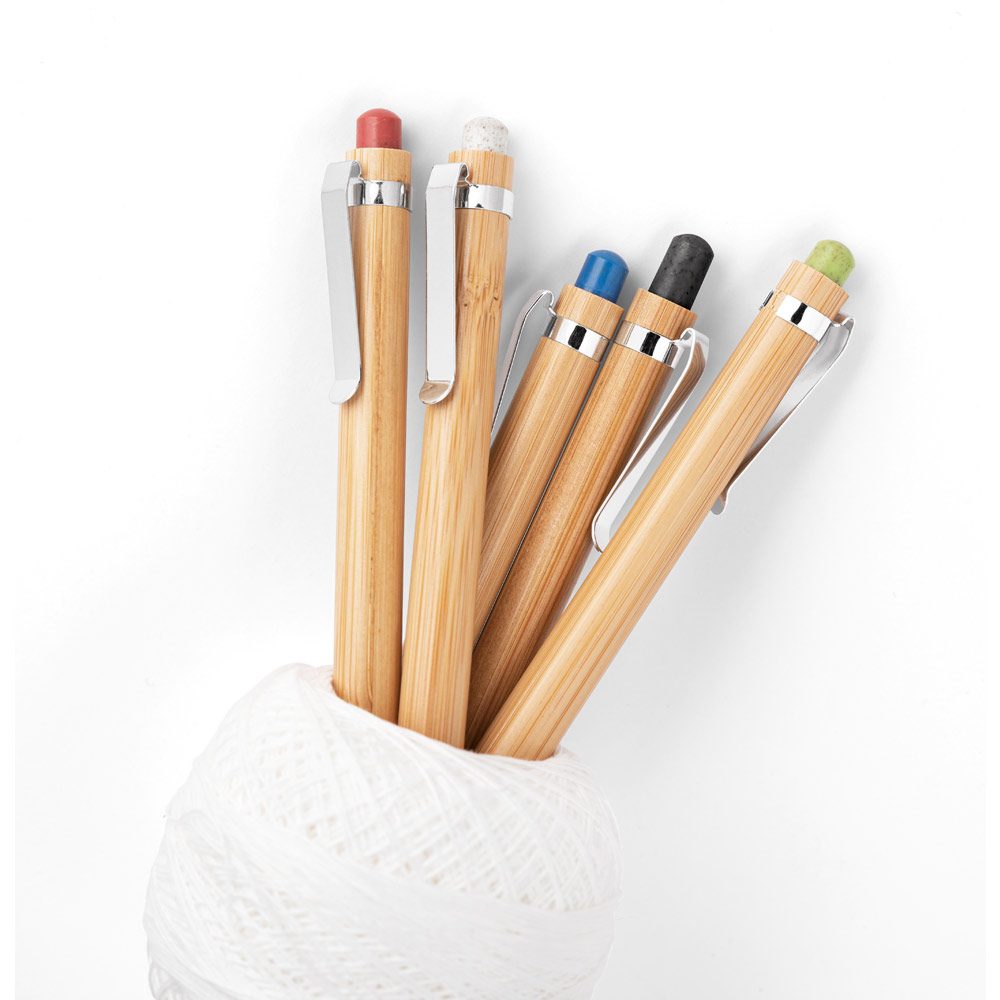Esferográfica em bambu e clipe em metal. Os elementos coloridos são em fibra de trigo e ABS. Até 1,5 km de escrita. ø11×142 mm