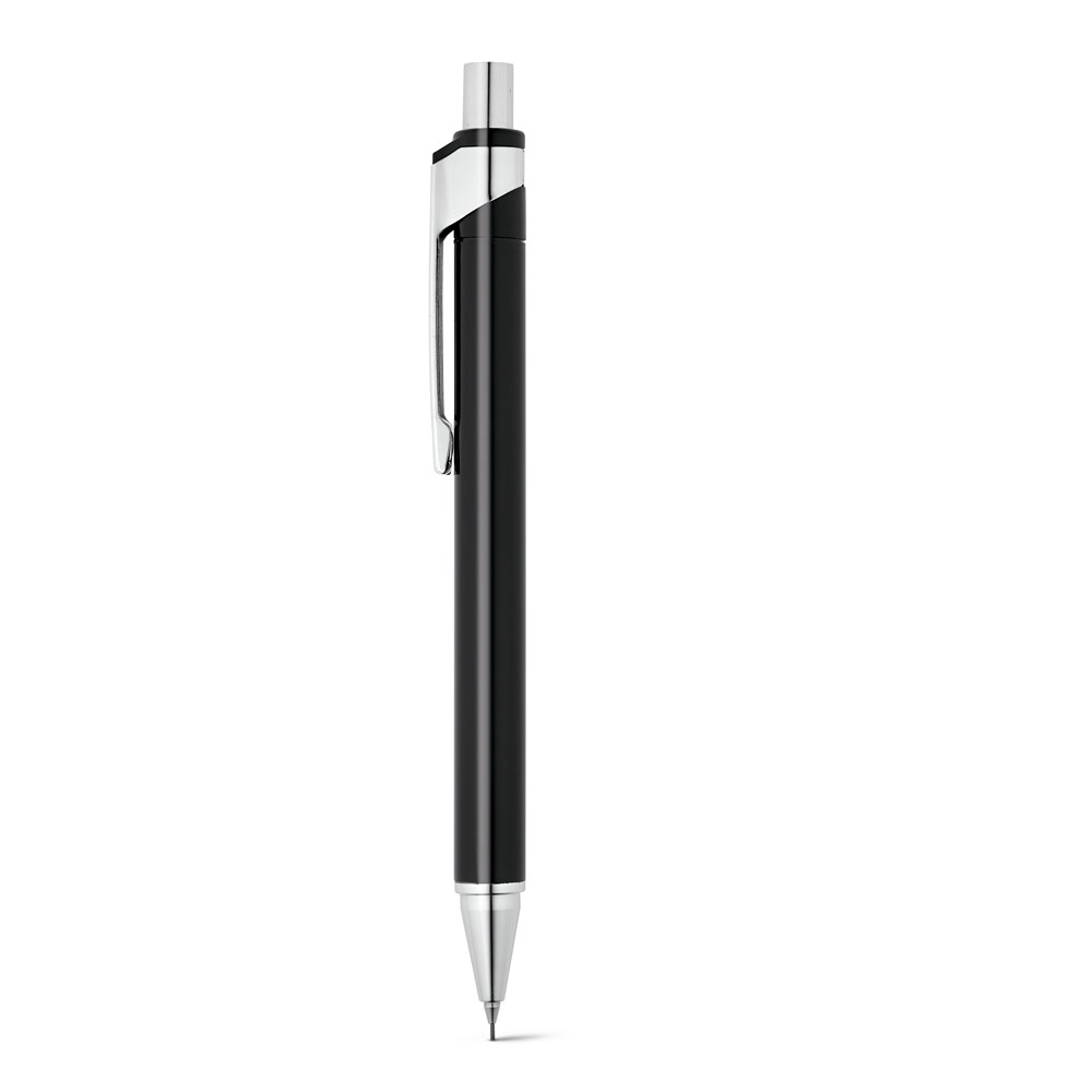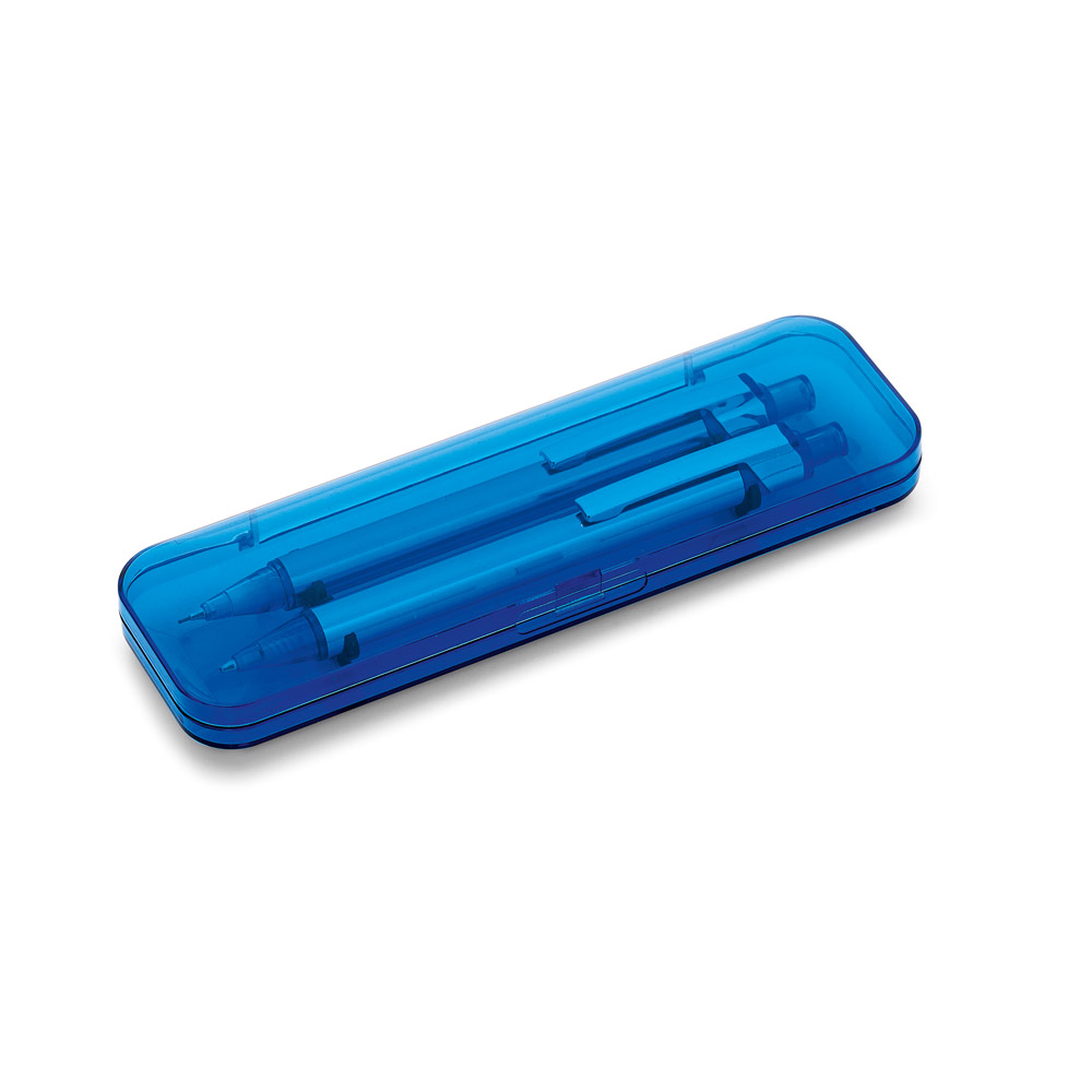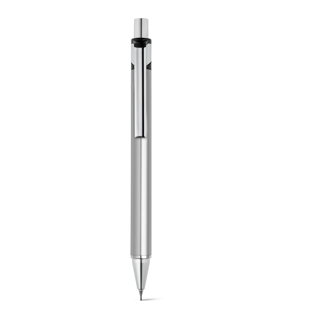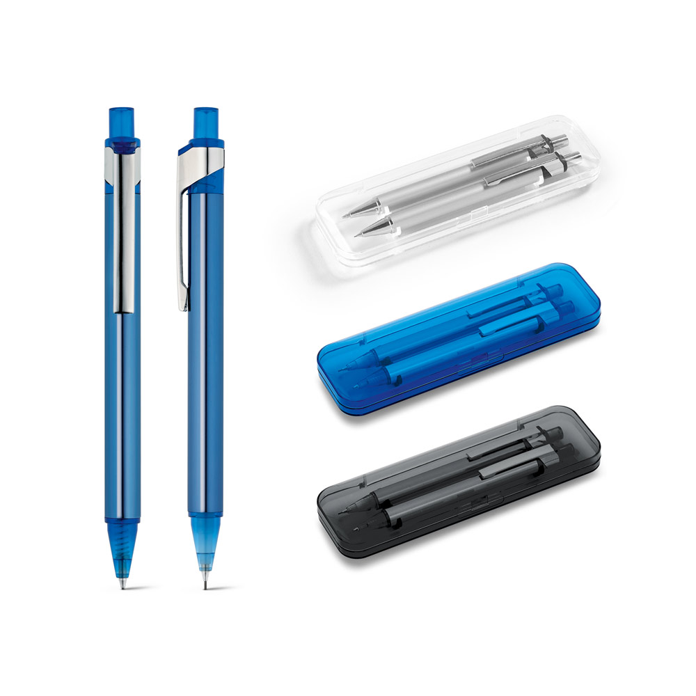 Conjunto de esferográfica e lapiseira em alumínio. Esferográfica até 1,5 km de escrita. Lapiseira com grafite 0.5mm. Incluso estojo. ø11 x 137 mm | Estojo: 165 x 50 x 24 mm