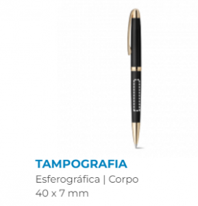 Esferográfica em metal com mecanismo twist, clipe e apontamentos em dourado. Fornecida em estojo em papel craft. ø11 x 139 | Caixa: 180 x 43 x 22 mm