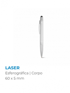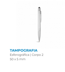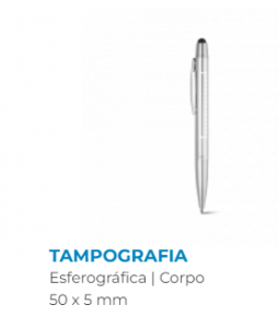 Esferográfica em alumínio com mecanismo twist, ponteira touch e clipe. Até 1,5 km de escrita. ø11 x 135 mm