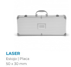 Kit churrasco em estojo de alumínio. Composto por luva de cozinha em poliéster e 6 utensílios em aço inox: faca chefe, 1 faca japonesa, 1 pinça, 1 garfo, 1 espátula e 1 afiador. Próprio para contato com alimento. Estojo: 450 x 170 x 80 mm | Placa: 80 x 50 mm