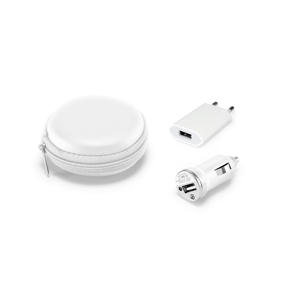 Kit de adaptadores USB em ABS. Incluso adaptador de corrente DC 110V/220V e adaptador para carro DV 12-24V. Fornecido com bolsa EVA. Bolsa: ø75 x 36 mm