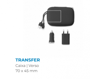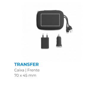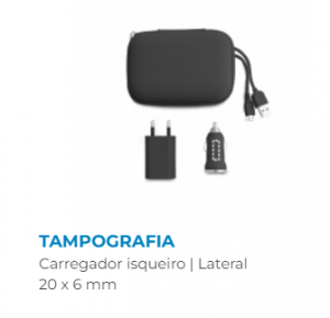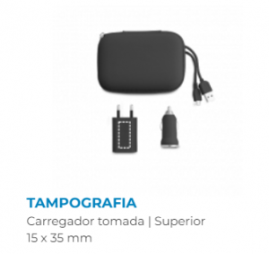 Kit de adaptadores USB em ABS. Incluso adaptador de corrente DC 110V/220V e adaptador para carro DV 12-24V. Fornecido com bolsa EVA. Bolsa: 112 x 80 x 45 mm