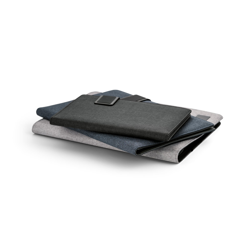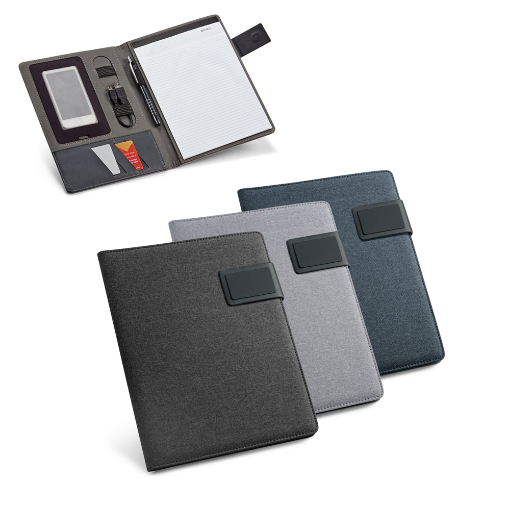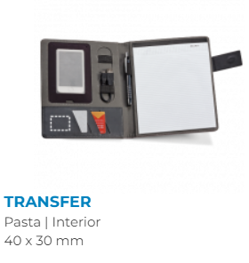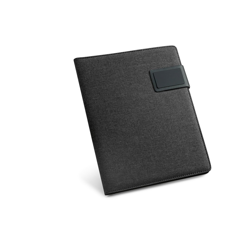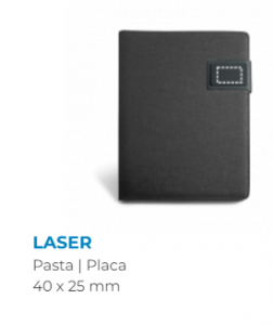 Pasta A5 em linho sintético e c. sintético com fecho magnético. No interior, contém um bloco (20 folhas pautadas), suporte para esferográfica (não inclusa) e outros compartimentos para acessórios (não inclusos). 183 x 252 x 18 mm | Placa: 50 x 30 mm