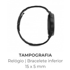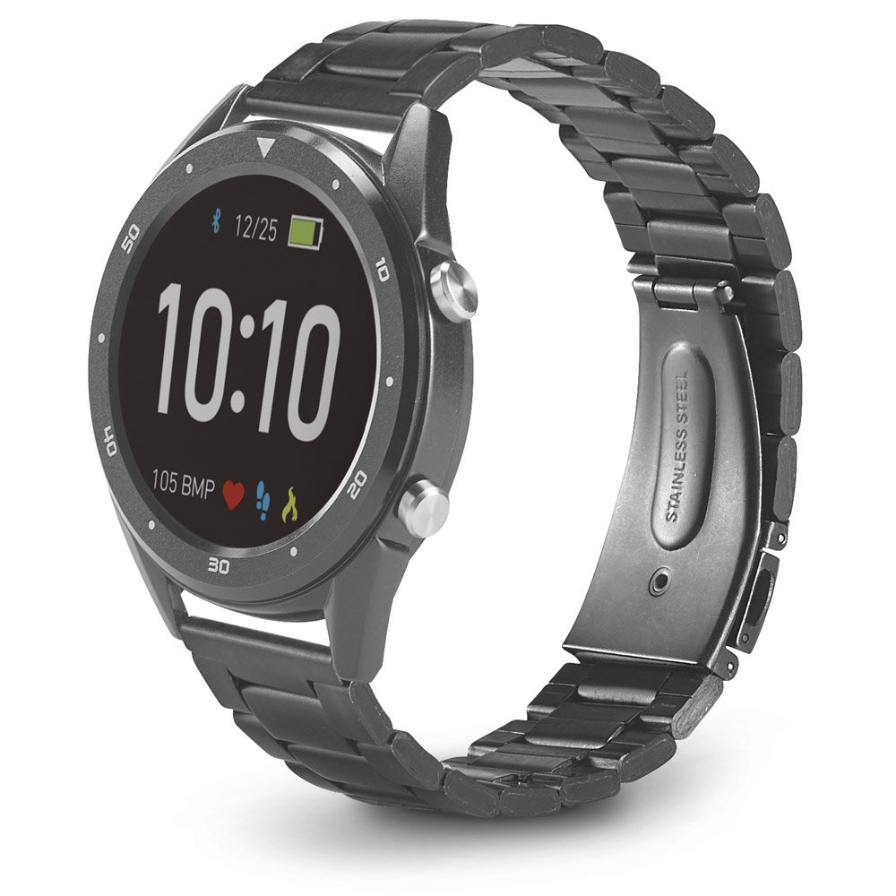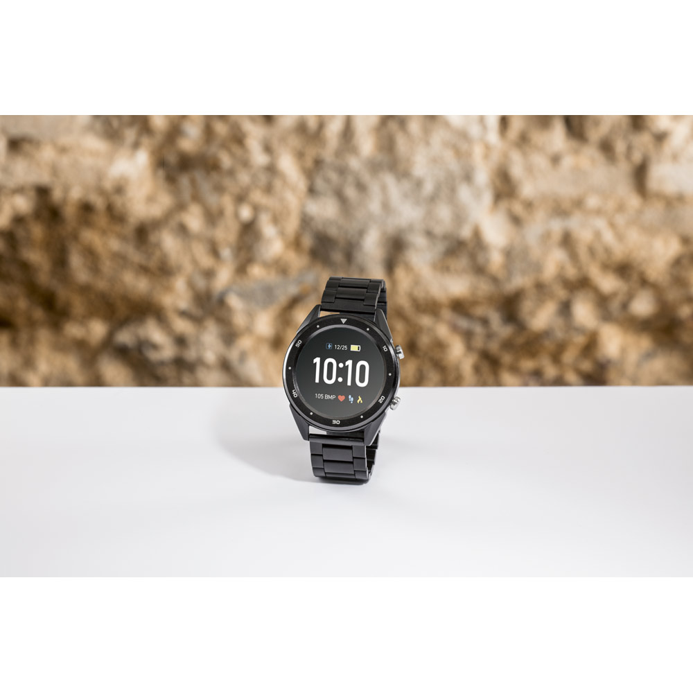 É um sofisticado relógio inteligente resistente à água com bracelete em aço inox e transmissão por bluetooth 4.2 (compatível com versões iguais ou superiores Android 5.0 e iOS 9.0). Um aliado para o dia-a-dia através de múltiplas funcionalidades: pedómetro, acesso a notificações e conexão à playlist do dispositivo móvel, monitorização do sono, frequência cardíaca, geolocalizador, despertador, entre outras. Tem uma resolução de tela de 240 x 240 px, capacidade de 230 mAh e autonomia em uso até 72 horas e em standby até 7 dias. Fornecido em caixa presente. 26 x 47 x 8 mm | Caixa: 120 x 120 x 70 mm