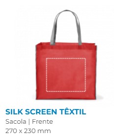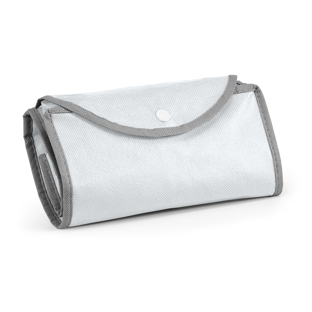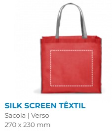 Sacola dobrável em non-woven (80 g/m²) com alças de 65 cm. Fornecida desdobrada. Dobrado: 200 x 120 mm | Aberto: 400 x 450 x 200 mm
