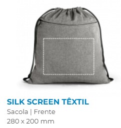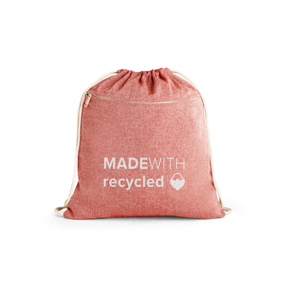Sacola tipo mochila em algodão reciclado (140 g/m²), com bolso frontal com fecho discreto e alças em algodão. 370 x 410 mm