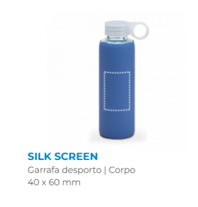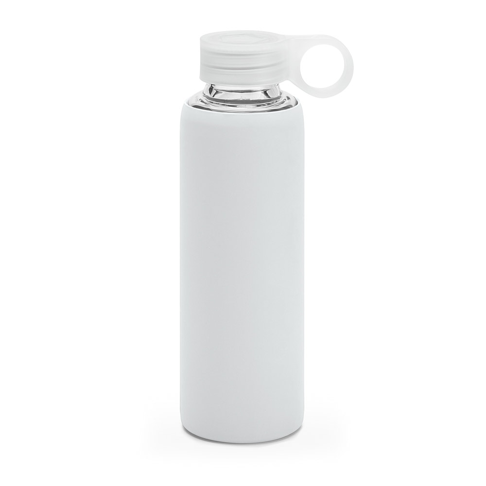 Squeeze em vidro borossilicato com tampa em PP e bolsa em silicone. Capacidade até 380 ml. Food grade. Fornecida em caixa. ø58 x 191 mm